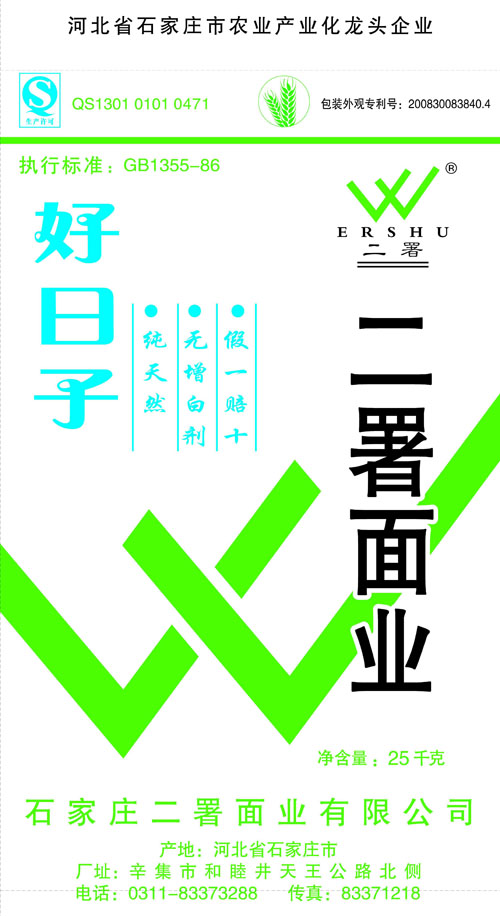 河北面業         二署面業有限公司創建于1989年,現已具備日處理小麥300噸的能量,產品質量穩定,深受客戶青睞。 二署面業地理位置優越,北靠307國道石黃高速,南鄰石德鐵路,衡井國道,交通十分方便,為貨物運輸提供保證及時運輸的天然條件。產品運銷:黑龍江、吉林、遼寧、河北、內蒙、陜西、山西等大中省份,贏得了廣大消費者的認可。 河北面業